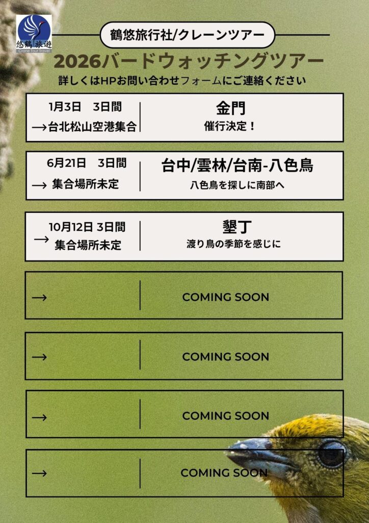 鶴悠旅行社(クレーンツアー)では2026年日本の方向けに、金門ツアーに続き台湾バードウォッチングツアー第二弾をご用意しました。